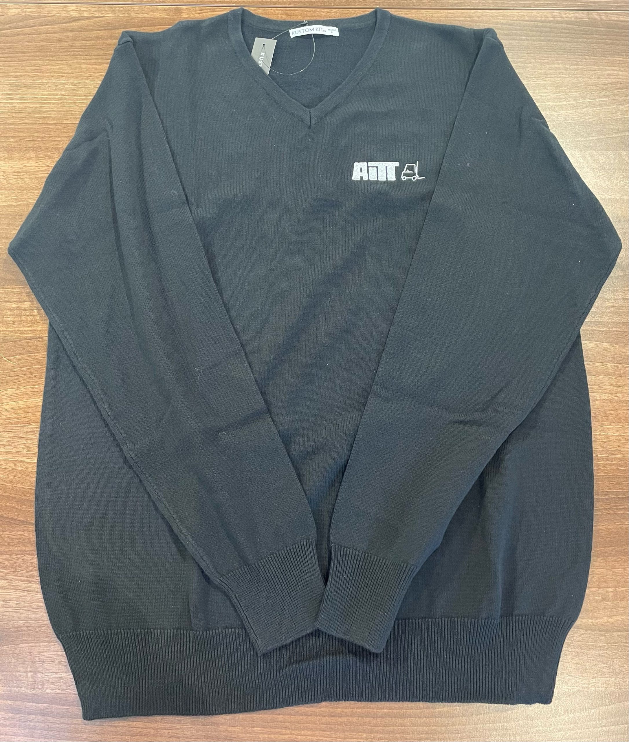 A black v-neck jumper, with the AITT logo embroidered in white.